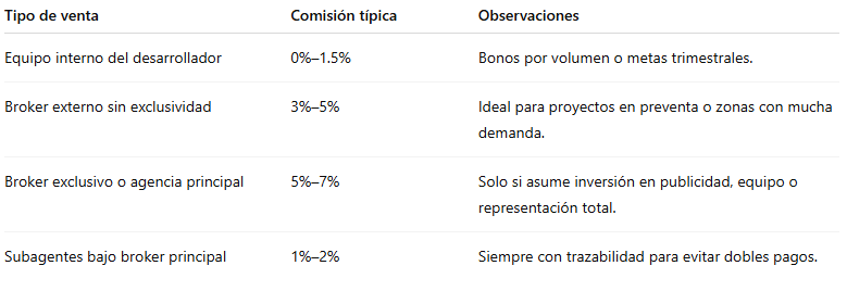 El porcentaje de comisión varía según el tipo de proyecto, ubicación y quién asume el peso del marketing. Pero en promedio, el mercado se mueve así: