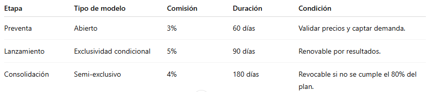Causal de revocatoria: si no cumple los compromisos operativos, se levanta la exclusividad sin penalización.